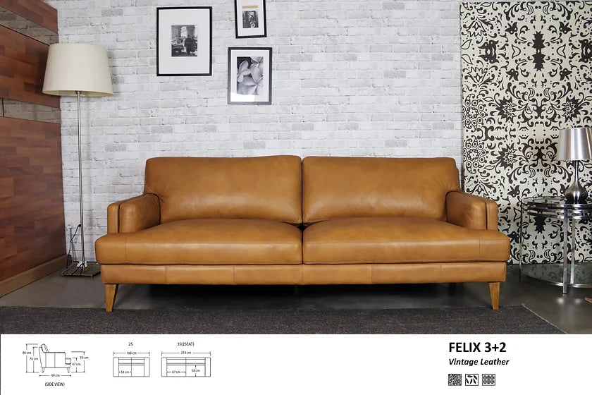 xIntroducing the Felix 3+2 Vintage Leather sofa, a blend of classic charm and modern comfort. Crafted with exquisite vintage leather, this sofa promises luxury and durability. Choose from various colors to match your style and elevate your space with timeless elegance.